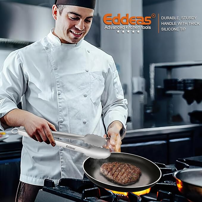 - FOOD-GRADE STAINLESS STEEL - EDDEAS kitchen tongs are made of 1mm thick food-grade stainless steel in one piece for enhanced robustness and heat resistance, rust resistance and easy handling. Tongs for cooking the overall light weight and ergonomic features are maintained.