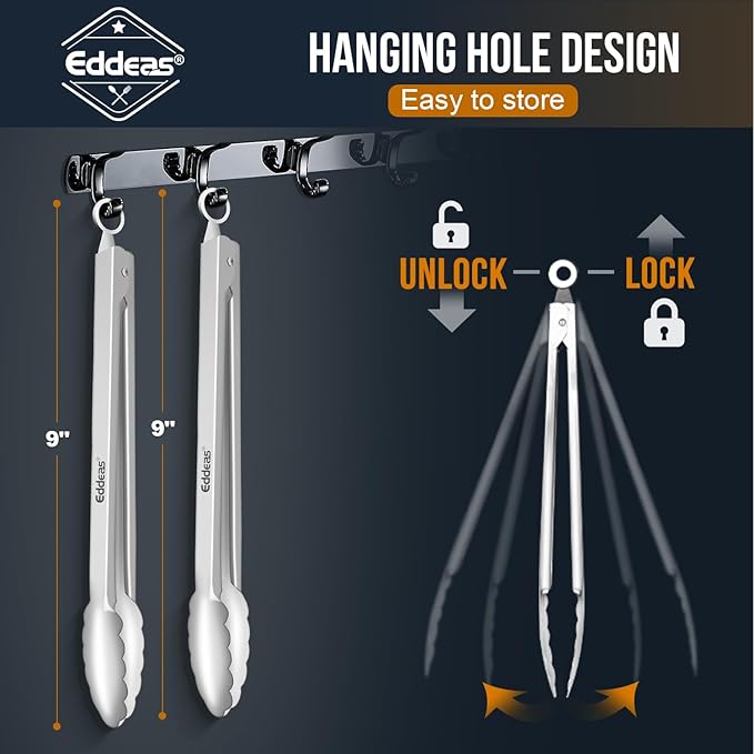 - MULTIPLE APPLICATION - Perfect for everyday kitchen tasks or outdoor use, whether you use them as salad tongs, grill tongs, need reliable metal tongs to grab food from boiling water, or as a grill Turner or salad server, EDDEAS tongs will meet your needs for safety and stability.Size: 2pcs 9inch tongs