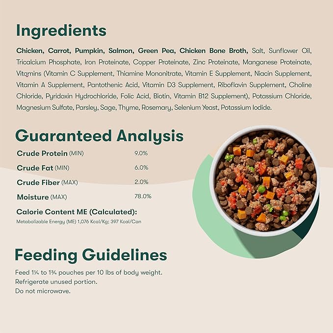 - ALL NATURAL INGREDIENTS: Crafted with premium, all-natural ingredients, including moist and meaty salmon, chicken, carrots, pumpkin, and bone broth. Better wet dog food starts with better ingredients.
