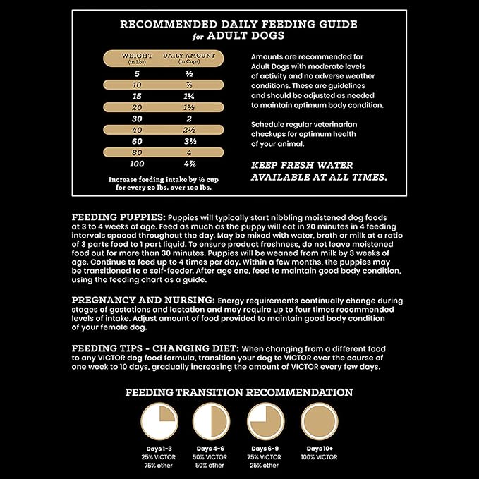 - HIGH PROTEIN DOG FOOD: Packed with premium-quality beef, chicken, pork and fish meals; With 30% protein and 20% fat, it provides young dogs and mothers with key nutrients for healthy growth and vitality, making VICTOR Hi-Pro Plus a reliable choice