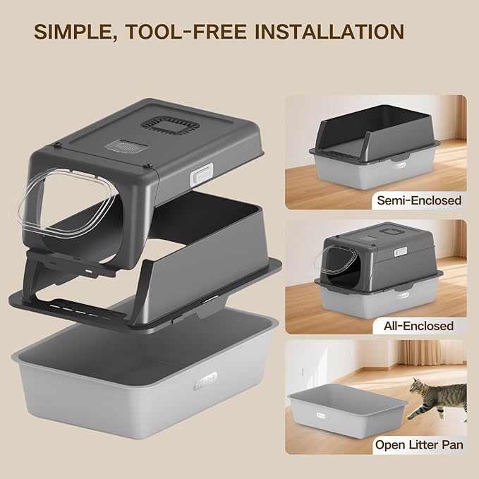 - Dual Mode – Semi-Enclosed or Fully-Enclosed Flexibility Customize your cat’s privacy by using the big cats litter box as either a semi-open or fully enclosed system. The upper lid features ventilation holes to improve airflow and reduce moisture buildup. Comes with a charcoal filter to neutralize odors and purify the surrounding air.