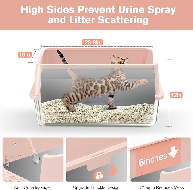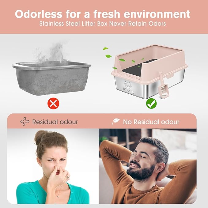 - 【Non Sticky, Odor Free Steel Cat Litter Box】: Unlike plastic alternatives, the stainless steel material does not absorb stains or odors.Its smooth, non-sticky bottom makes it very easy to clean, and these make it easy for you to maintain a fresh and clean environment for your beloved cat kitty. This feature alone makes it a standout choice for cat owner who prioritize cleanliness like you.
