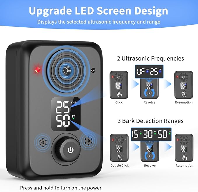 - Portable & Easy to Use: Stop barking dog devices is designed to be user-friendly, lightweight and portable, making it easy to use and carry. When the dog barks, the device emits ultrasonic waves, and when the dog stops barking, the ultrasonic waves also stop, without having to turn them off. It is also effortlessly installed in a variety of locations, whether it is a dog house or a tree, and is simple to operate.