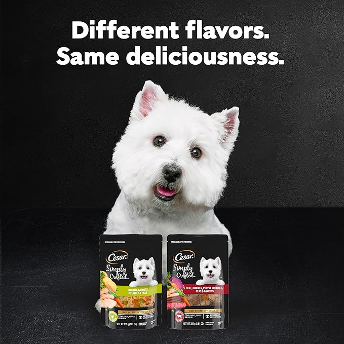 - Resealable Packaging: Cesar Simply Crafted Beef, Chicken, Purple Potatoes, Peas & Carrots In Natural Juices Wet Dog Food Complement is packaged in a resealable pouch to help keep it fresh and easy to refrigerate after opening