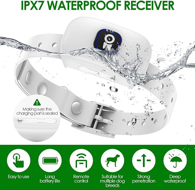 - š¾ćIPX7 Waterproof & RechargeablećInvisible fence for dogs is adjustable. It's suitable for all size of dogs (8 to 80 pounds). The collar is made of reflective fluorescent TPU material, which improves the safety of dogs at night. Both transmitter and receiver collar are rechargeable. Wireless Dog Boundary Receiver Collar is made of IPX7 waterproof material, which means your dog can get wet in the grass, mess with the sprinkler or play in the rain with this wireless training collar.