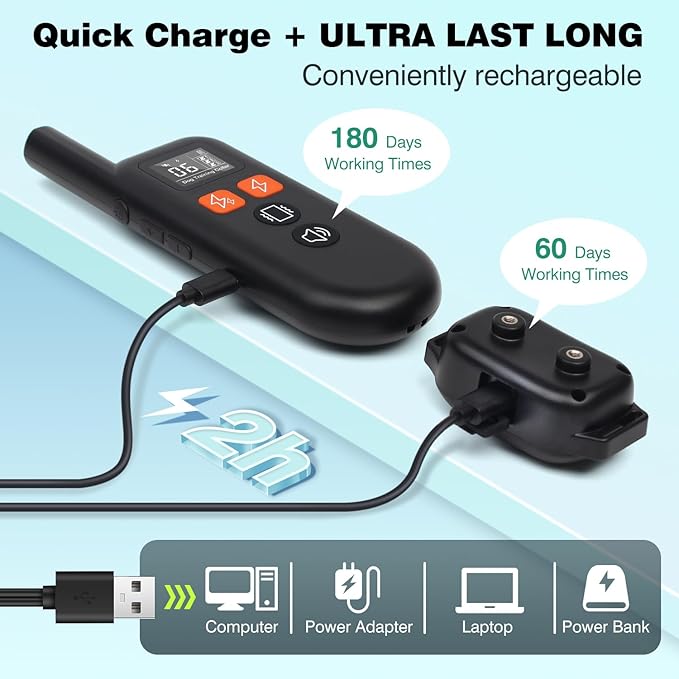 - Quick Charge & Ultra Last Long: The dog collar can last up to 60 days after 2 hours of charge, easy to charge with our car charger or power bank, without worrying about being out of power when we are running or camping with dogs.