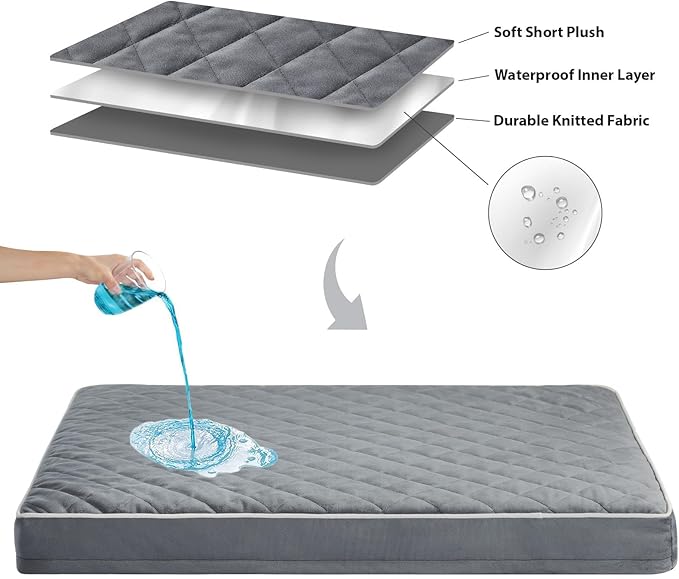- 【Waterproof & Anti-Slip】The dog bed waterproof layer ensures that the dog's urine and saliva will not seep in and cause any unnecessary mess or unpleasant odor. The large dog bed also has a durable oxford cloth bottom with anti-slip dots to keep it in place when your dog is playing.
