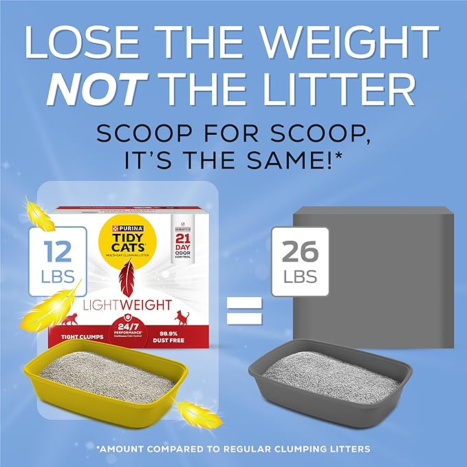 - Tidy Cats lightweight litter is easy to carry, pour and store, and the lightweight formula is 50 percent lighter than the leading clumping litter