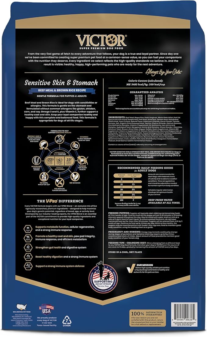 VICTOR Super Premium Dog Food — Sensitive Skin and Stomach — Beef Meal & Brown Rice Recipe Dry Kibble — Gluten Free, No Chicken, Ideal for Dogs with Allergies — Adult and Puppy Food, 15 lb