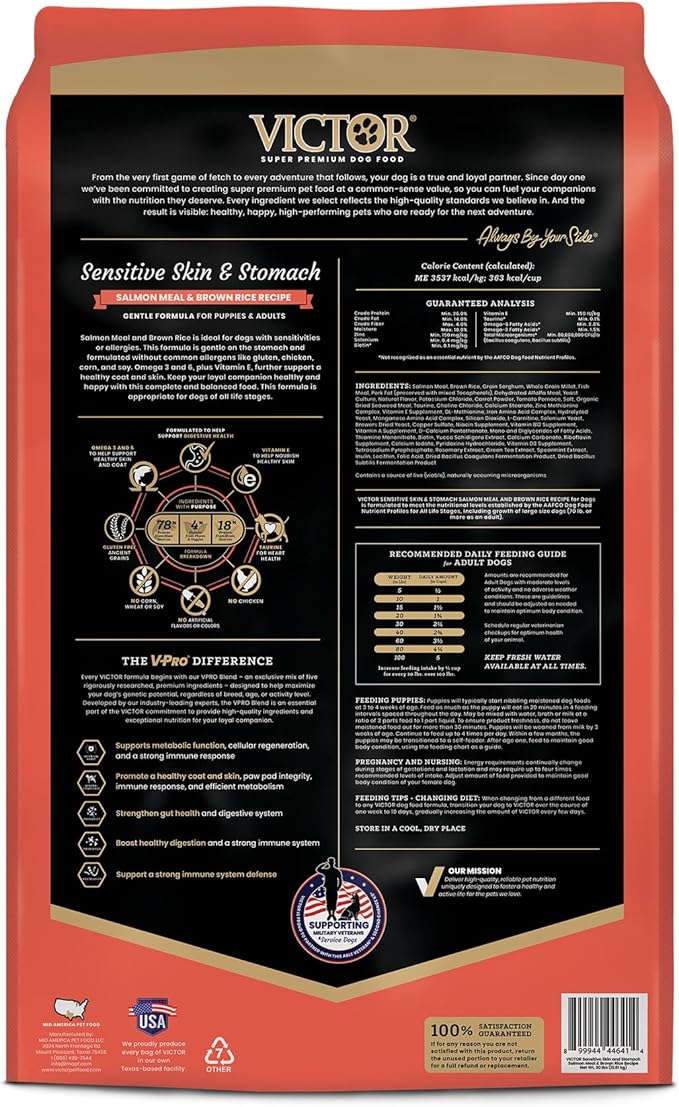 VICTOR Super Premium Dog Food — Sensitive Skin and Stomach — Salmon Meal & Brown Rice Recipe Dry Kibble — Gluten Free, No Chicken, Ideal for Dogs with Allergies — Adult and Puppy Food, 5 lb