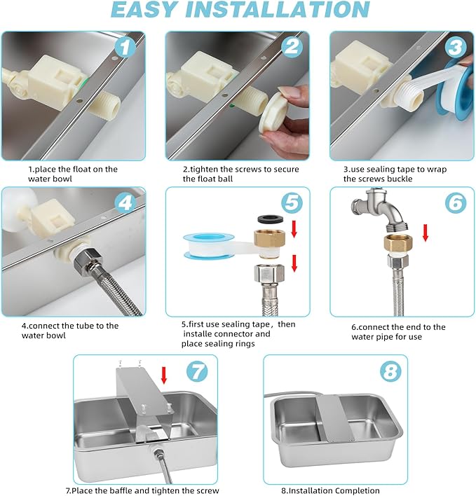- Easy installation: Auto fill dog water bowl complete fittings, no professional tools or skills are needed, easy to install and use; Equipped with 1/2" hoses and 1/2" to 3/4" copper adapter is designed to fit faucets with GHT 3/4" threads, also comes with 4 anti slip sticker to prevent pet water dispenser from sliding on smooth surfaces; Please check thread compatibility before order