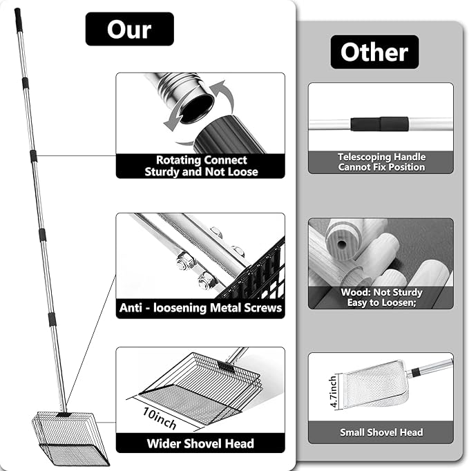 - 🔧 Multi-Purpose Sifter Shovel: More than just a chicken coop cleaner, this tool transforms easily into a cat litter scoop, sandbox shovel, cow stall cleaner, or beach sand scooper. Perfect for farmers, pet owners, and outdoor enthusiasts looking for a reliable, all-in-one cleaning tool