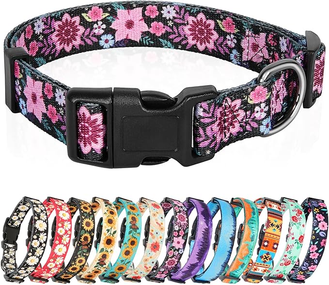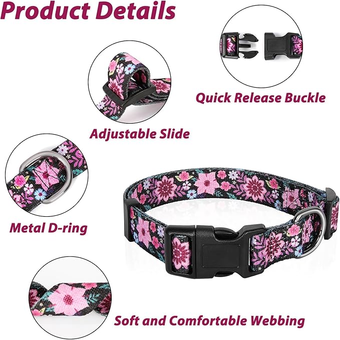 HEELE Dog Collar, Adjustable Soft Dog Collar for Small Medium Large Dogs,Floral Patterned Puppy Collars with Quick Release Buckle Galsang Black S Length 9.84''-14.96'