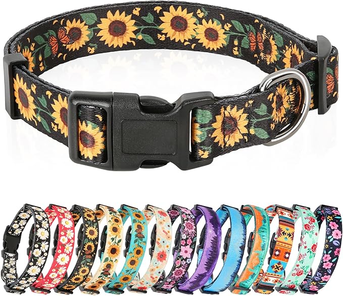 HEELE Dog Collar, Adjustable Soft Dog Collar for Small Medium Large Dogs,Sunflower Floral Patterned Puppy Collars with Quick Release Buckle Sunflower Black M Length 13.39''-20.87''