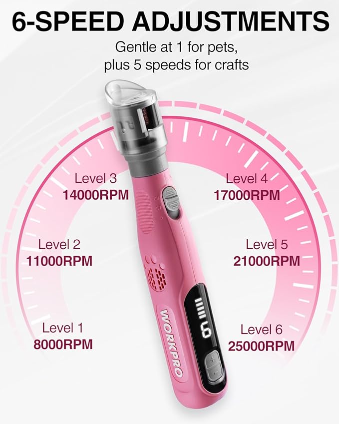 - 6-SPEED LEVELS: Quiet dog nail grinder with 6 speeds (8000–25000 RPM). Level 1 for safe nail grooming; other 5 levels for carving, sanding, polishing with 70 versatile accessories