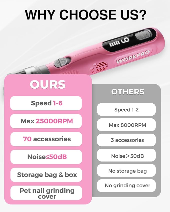 - SAFE & EFFECTIVE GRINDING: WORKPRO pet nail grinder quiet for dogs and cats includes sanding sheets for dogs and grinding wheels for cats. With the protective guard, it ensures safer, effective nail care for all pets