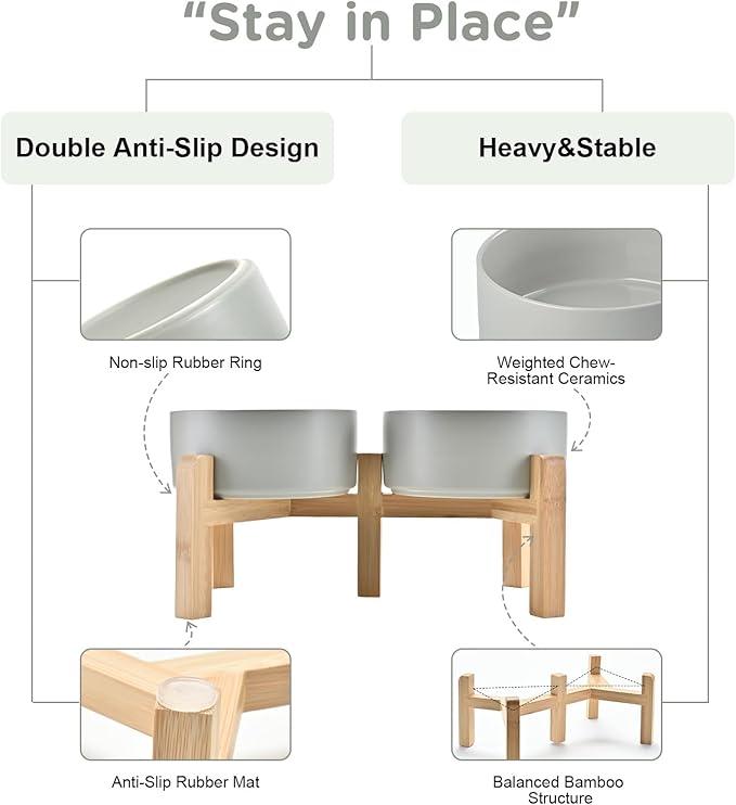 - Stable, Tip‑Resistant Design – A solid bamboo frame with Chew‑Resistant Heavyweight Ceramic, wide stance, and slip‑proof silicone pads join forces to create raised dog bowls that STAY IN PLACE on tile, wood, or laminate. Fewer spills mean cleaner floors and no accidental gouges or scratches or noisy