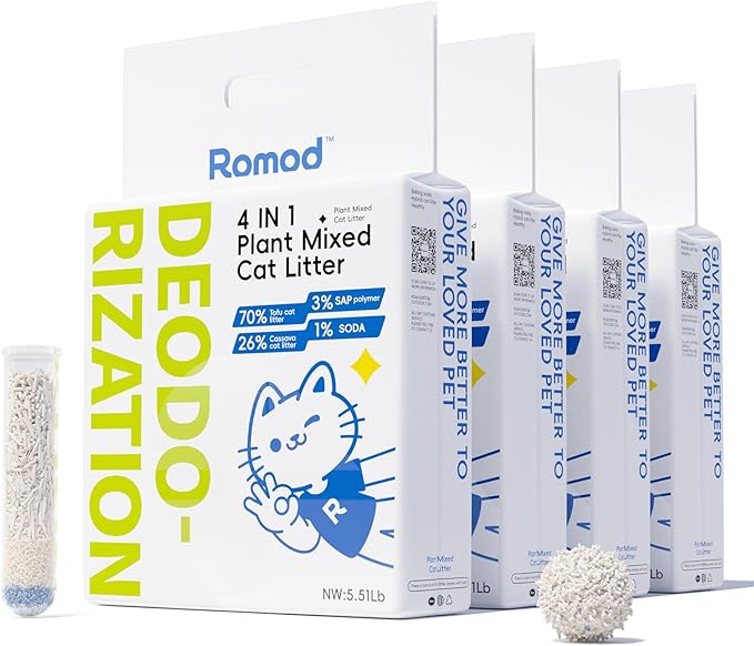 4-in-1 Tofu Cat Litter, Mixed Cassava, Baking Soda, SAP, Natural Plant, Fast Clumping, Strong Water Adsorption & Deodorization, No Tracking, Dust-Free, Flushable, (5.5lb x 4bags)