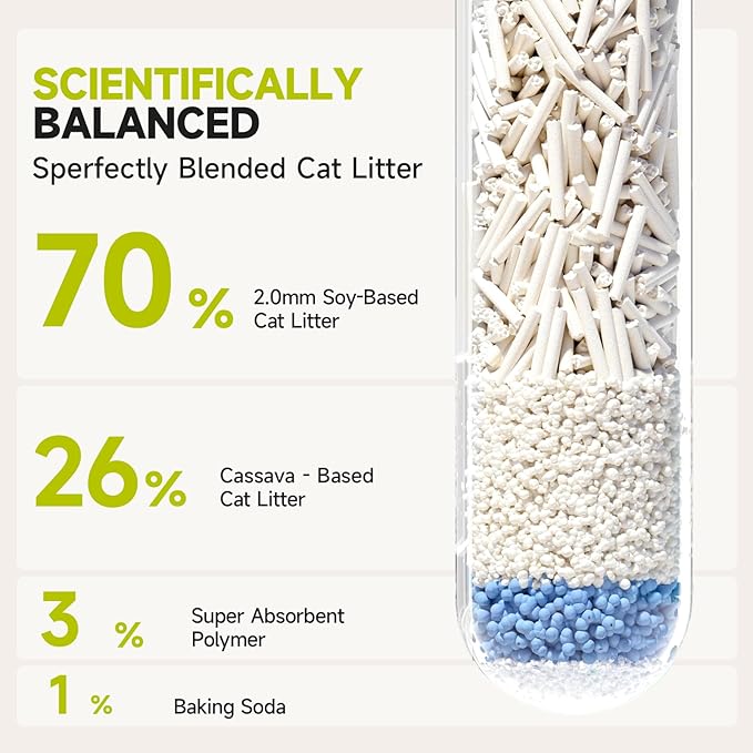 - 4-in-1 Premium Multi-Ingredient - A perfect combination of tofu litter, cassava litter, SAP (super absorbent polymer), and baking soda, offering natural and efficient performance.