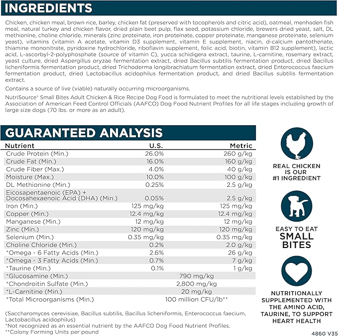 - CONTAINS: (1) 4LB Bag of NutriSource Chicken and Rice Small Bites Dry Dog Food