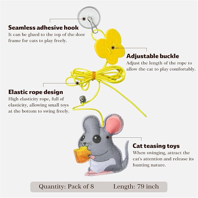 - 【Smart Adjustable Design】Customize play height effortlessly with our knot-adjustable rope system. Create the perfect challenge for kittens or senior cats. Versatile installation lets you play together while working or relaxing – simply hang from desks, sofas, or cat trees.Includes a premium 33-foot (10m) replaceable elastic rope - engineered for maximum durability and extended play sessions, letting your cat enjoy hours of active hunting-inspired fun!