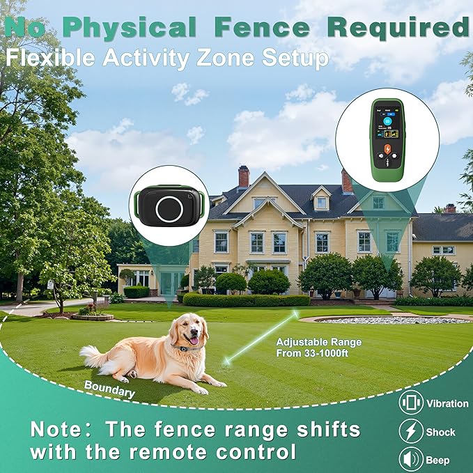 - Flexible Wireless Containment: Set up an invisible boundary anywhere with our Wireless Dog Fence, offering an adjustable radius from 33 to 1000 feet. This flexible, remote-centered fence ensures your dog stays safe within designated areas, perfect for yards, parks, or any open outdoor space. You'll find it's a superior alternative to traditional electric fence for dogs systems, offering unparalleled portability.