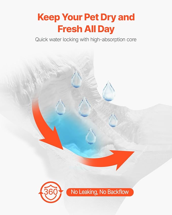 - Super Absorbent: VEVOR S-sized disposable female dog diapers feature a super absorbent core that quickly locks in liquid, offering 360° leak-proof protection with no backflow. Perfect for dogs in heat cycles, pet training, incontinence, post-surgery recovery, and travel. Suitable Waist Size: 12-20 inches / 30.48 - 50.8 cm