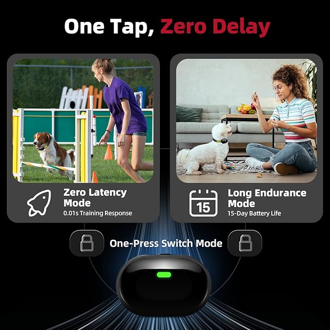 - 【3 Humane, Adjustable & Safe Training Modes】This dog training collar offers 3 effective modes: beep, vibration (0–99 levels), and safe static stimulation (0–99 levels). No jump abruptly in intensity, the smooth, linear adjustment ensures gradual changes for a more comfortable, controlled training experience. A convenient one-press switch lets you choose between zero-latency mode for instant correction and long-endurance mode for extended training sessions, adapting to any training scenario.