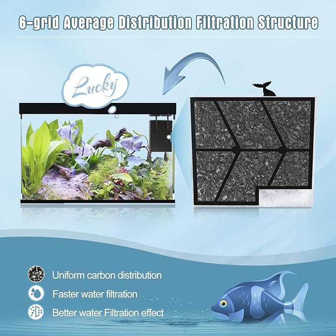 - Upgraded 6-grid Filtration Structure: We upgraded the structure of filter cartridges to use high density cotton + 50% more nutshell activated carbon + upgraded 6-grid design, which make the distribution of carbon more uniform without accumulation. Maximize water circulation efficiency and ensure the fish tank is always clean.