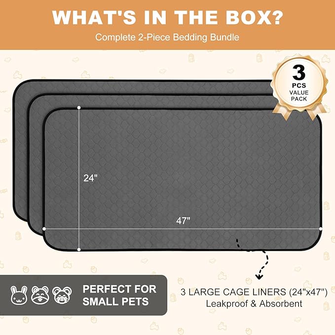 Washable Guinea Pig Liners for Cage, 3 Pack 24" X 47" Super Absorbent Reusable Guinea Pig Bedding Pee Pads Tarp Bottom for C&C Cage with Rabbits, Bunny, Chinchesillas, and Other Small Animals